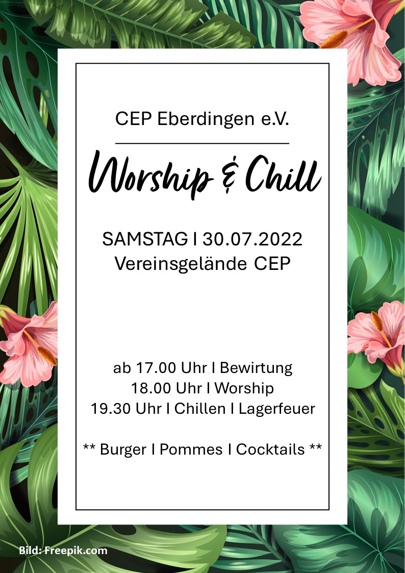 Am Samstag, 30.07.2022 gibt es bei uns das erste Worship & Chill event auf dem CEP Platz